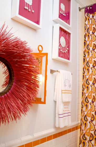 one of my favorite designers experiments with a wild pink mirror and orange subway tile. the paisley shower curtain isn't quite my taste, but don't you love the color scheme?