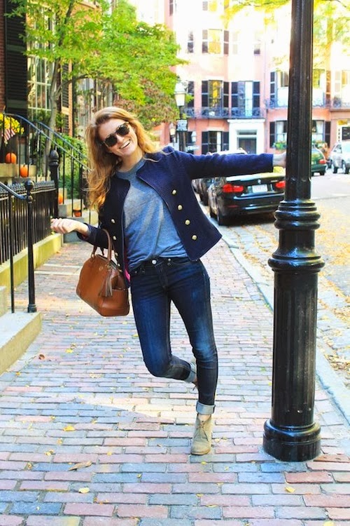 Oh man, these pictures bring back the best memories from our trip to Boston! Carly and I took these outfit pictures the day after one too many gin and tonics my beloved Red Sox advanced to the World Series on the most perfect fall day in Beacon Hill. We're both wearing pieces from our friend Elizabeth McKay's beautiful collection — I can't get enough of this navy cropped jacket and its hot pink silk lining. It feels like it was made just for me!